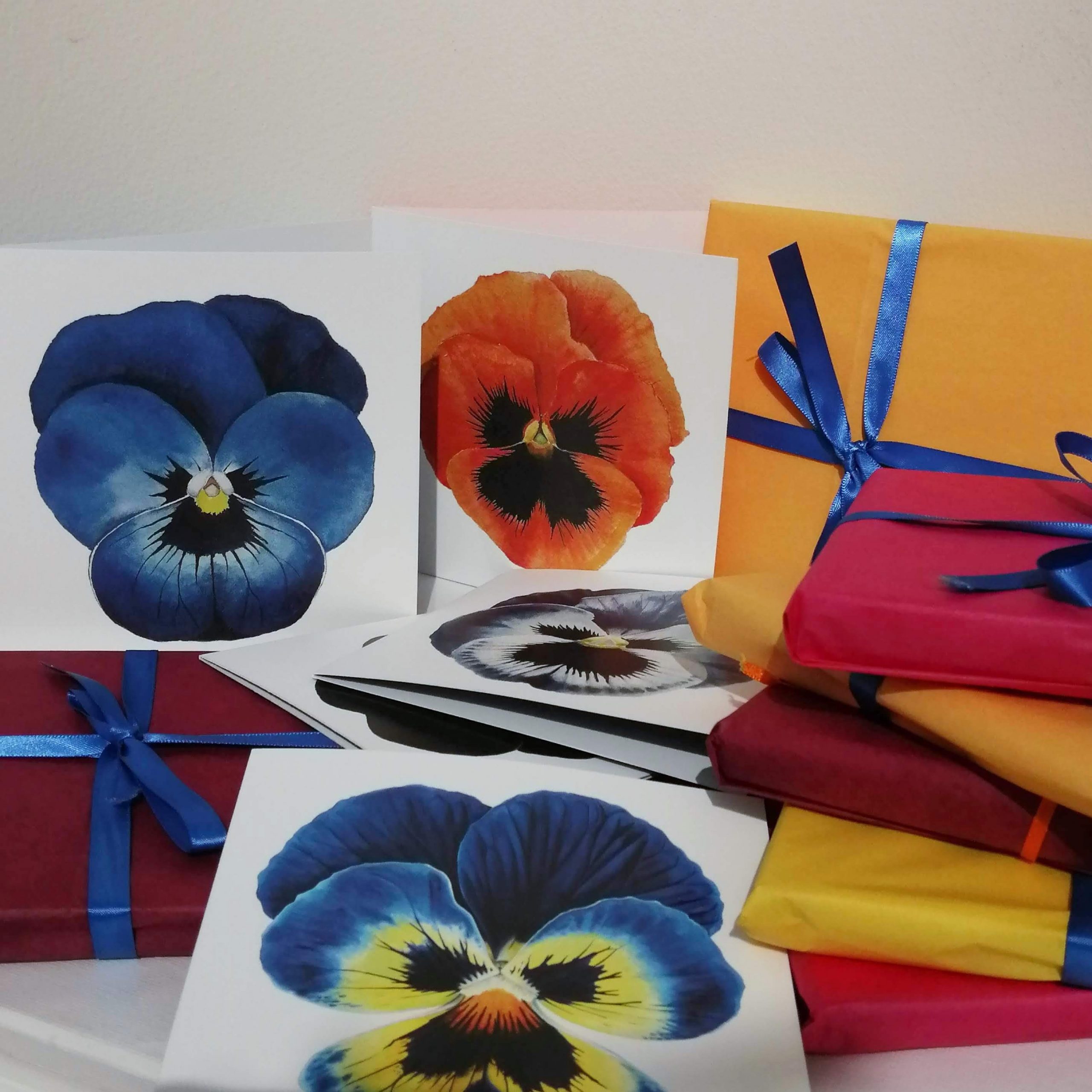 A selection of ten square, limited edition botanical greetings cards showing ten designs from J R Shepherd's Pandemic Pansy Collection. Every pack of ten cards is hand gift-wrapped in bright tissue paper and colourful ribbons and would make a beautiful gift.
