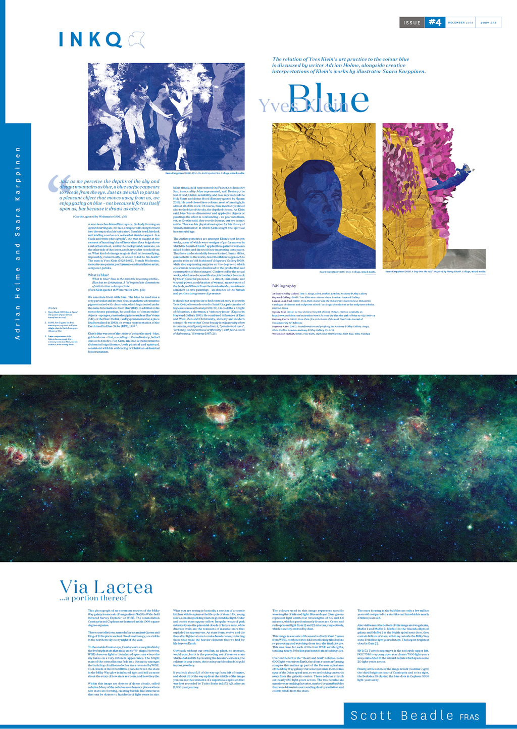 INKQ 4 marks the climax of INKQ's focus on blue with an essay by Adrian Holme on Yves Klein and his relationship to the colour blue. Adrian's words are accompanied by Saara Karppinen's unusual but beautiful illustrative collages.
